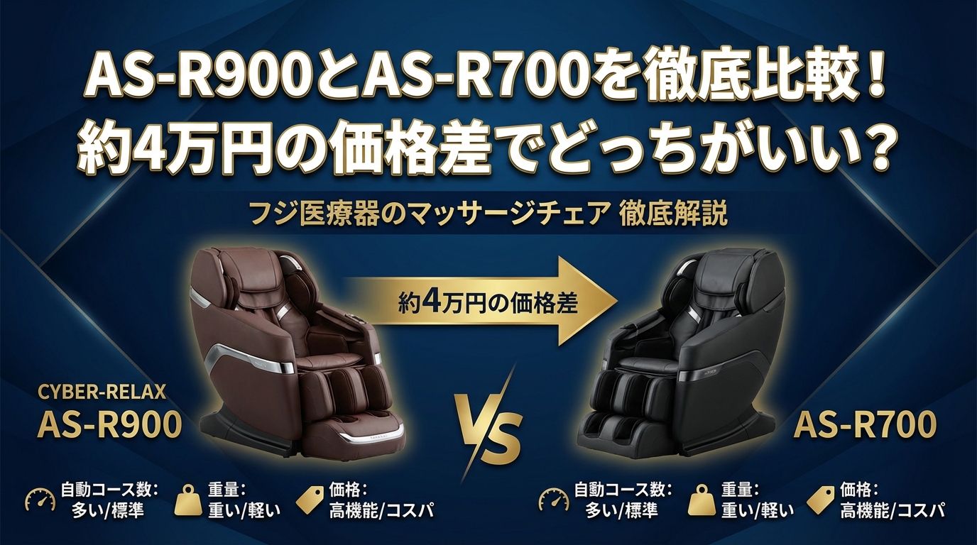 フジ医療器のマッサージチェア「CYBER-RELAX AS-R900」と「AS-R700」。 どちらも魅力的な機種ですが、「約4万円の価格差で何が違うの?」「型落ちの上位モデルと新しいミドルモデル、結局どっちを買うべき?」と悩みますよね。