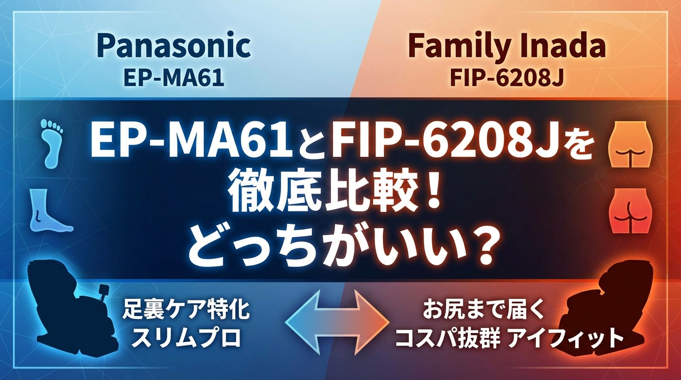 パナソニック「EP-MA61」とファミリーイナダ「FIP-6208J」は、どちらも毎日の疲れを癒やす優秀なマッサージチェアです。 しかし、得意とするマッサージ部位やサイズ感が明確に異なるため、ご自身の体や部屋に合った1台を選ぶことが重要です。