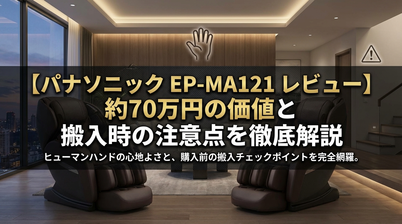 一方で、約100kgという重量とサイズの大きさから、搬入経路の確保や設置スペースの確認は必須条件です。しかし、そのハードルを乗り越えた先には、「疲れて帰ってきてEP-MA121に揉まれてホッとする」という、かけがえのないリラクゼーションの時間が待っています。